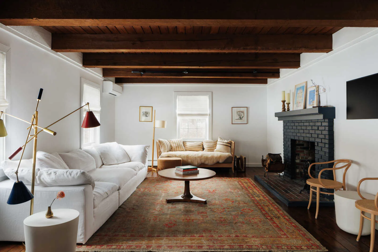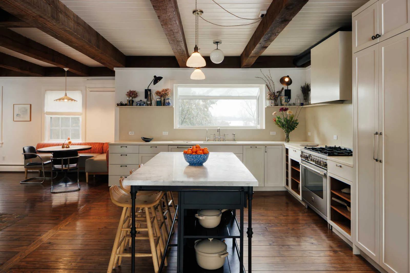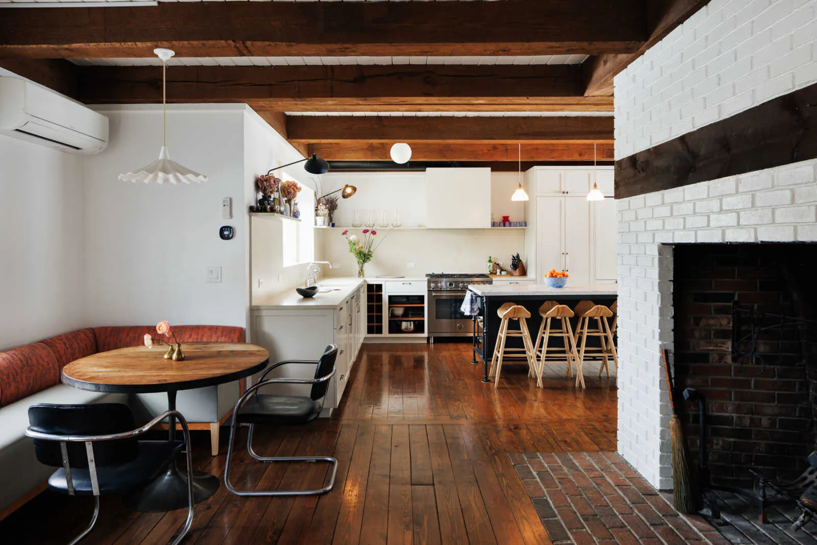 The main entry opens to a striking brick fireplace, anchored by a custom corner breakfast nook that sets a warm, inviting tone. To your left, a quintessential upstate kitchen with custom cabinetry, 6-burner stove, concrete counters, open shelving and panel ready fridge. Designed for both entertaining and everyday comfort, the home includes a spacious dining room that flows seamlessly to the rear deck, a cozy living room with fireplace, a front parlor, charming half bath and a separate playroom or flex space.