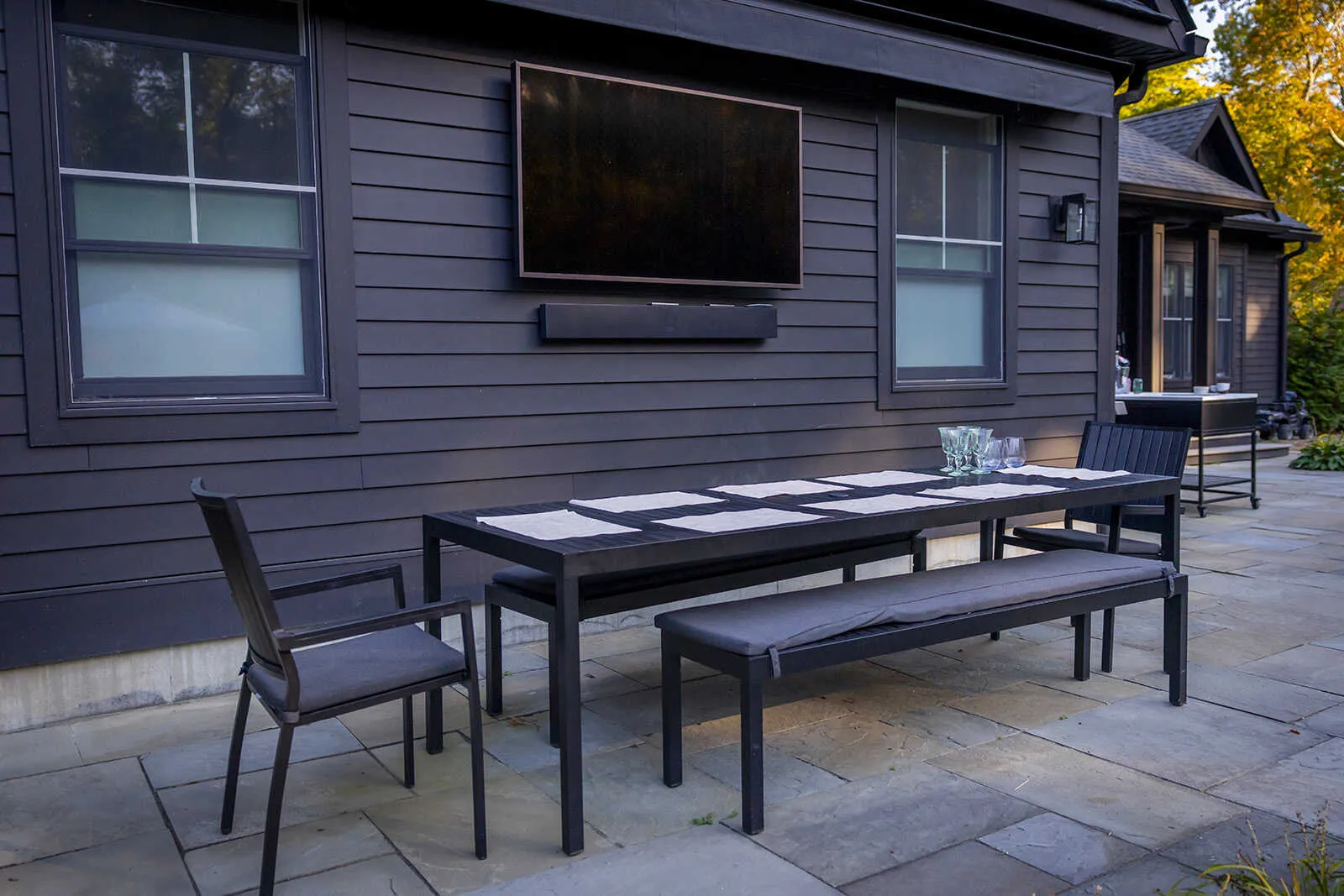 fire pit seating area, outdoor dining space for 10 people with TV and retractable