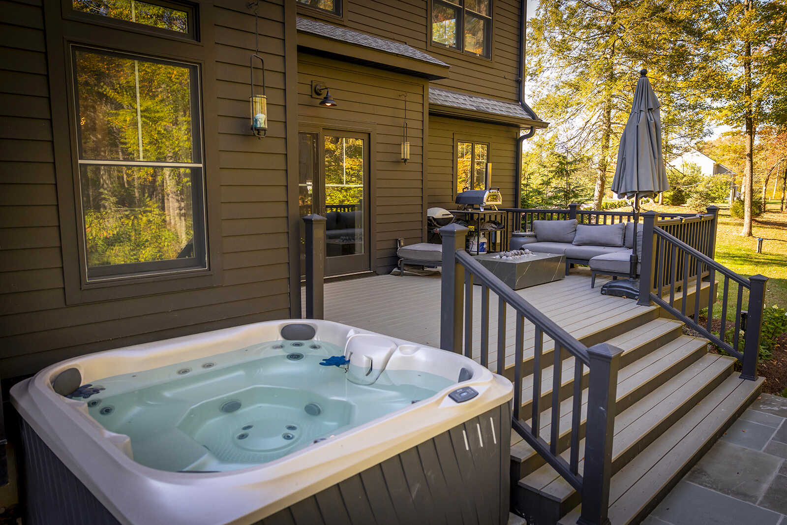 pizza oven, a year-round hot tub next to an outdoor propane fireplace, dedicated