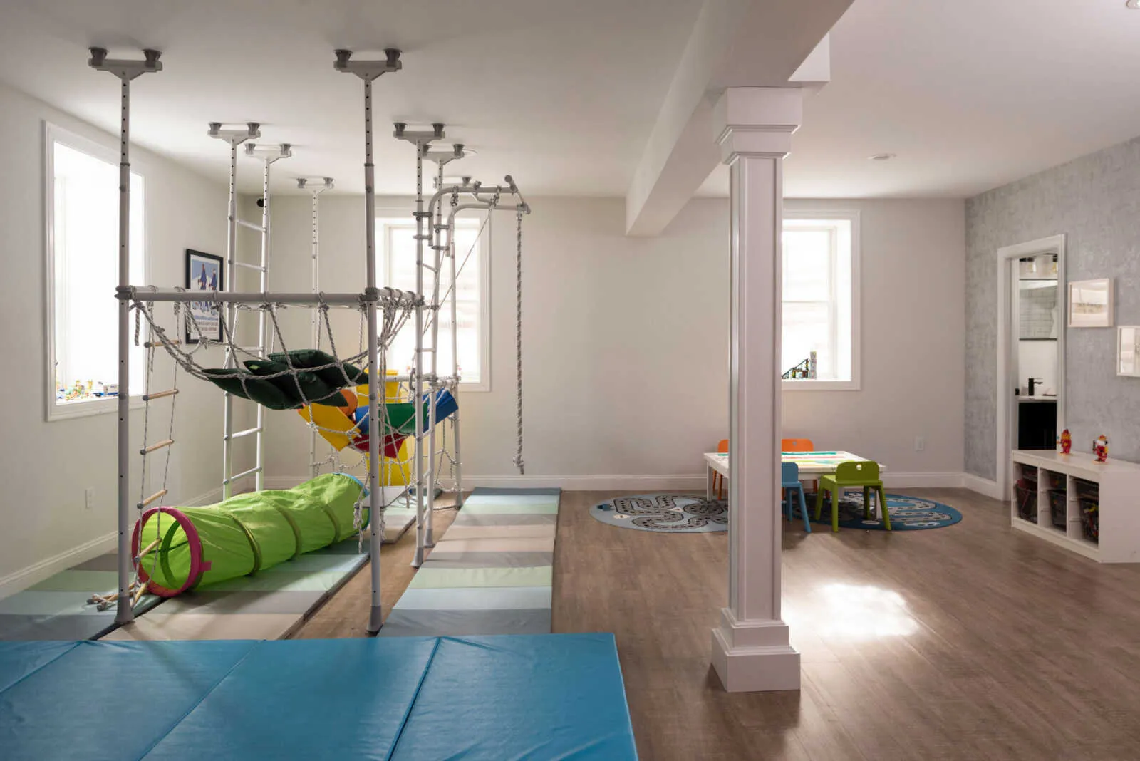 suite, a playroom, powder room, laundry room, and direct access to the garage.