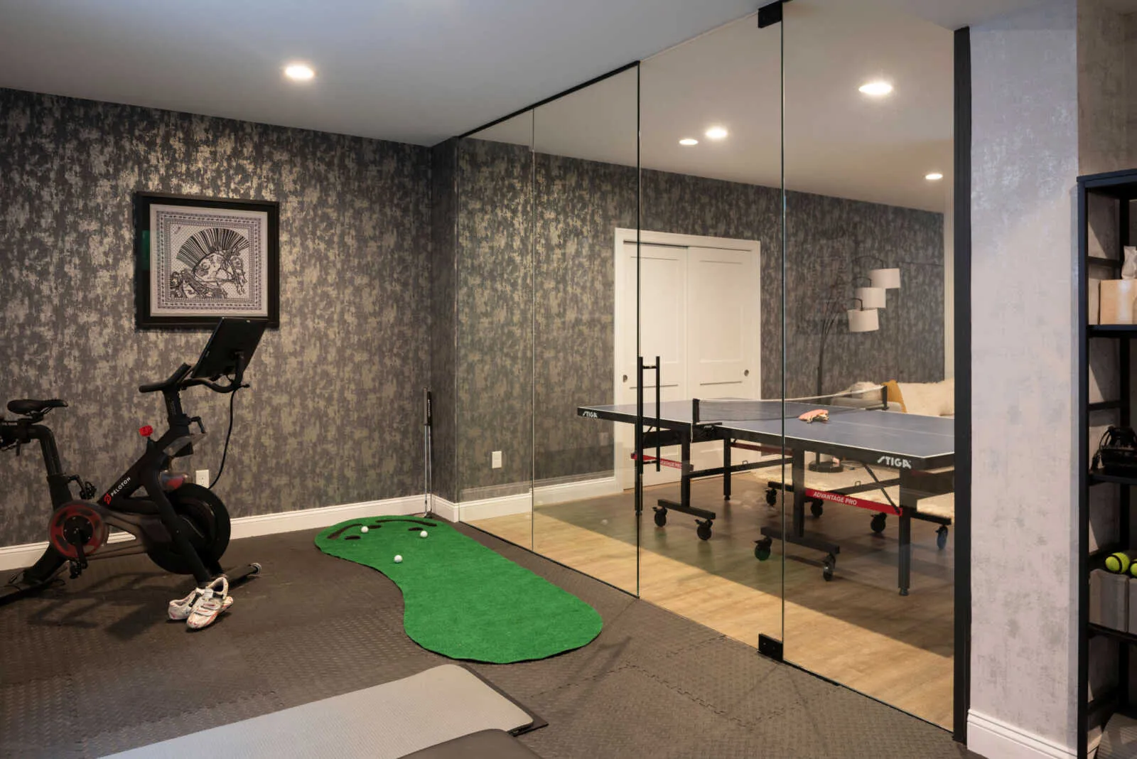 and dedicated fitness room featuring a Peloton bike and Tonal system. An